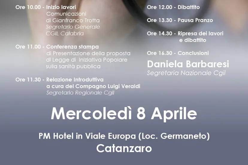 ![]() VOCI DI DONNA 8 aprile 2026 - presso la sede della Cgil Campania - via Toledo, 353 – ore 10,00 - Napoli La segretaria confederale della Cgil Lara Ghiglione nell’ambito del ciclo […] ![]() ESECUTIVO REGIONALE E PRESENTAZIONE DELLA PROPOSTA DI LEGGE DI INIZIATIVA POPOLARE SULLA SANITA’ PUBBLICA 8 aprile 2026 - presso PM Hotel in viale Europa (Loc. Germaneto) - ore 10.00 - […] |
