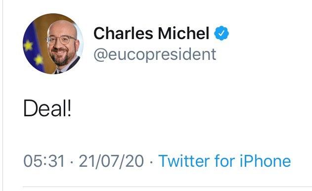 Sono le 5.31 del mattino di oggi, 21 luglio 2020 quando il presidente del Consiglio europeo, Charles Michel scrive finalmente una sola parola sul suo account Twitter: “Deal!”, “Accordo!”. E il vertice Ue che ha prodotto questo risultato entra nella storia.
