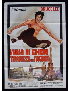 “Dalla Cina con furore” è il film che rese Bruce famoso in tutto il mondo. Interpretava il ruolo del giovane Chen Jeh, allievo di una palestra, in una Shangai del 1910 occupata dai giapponesi, che vendica il proprio maestro sfidando i campioni nipponici. Kung-fu contro karatè. Un tema ricorrente, ad esempio nei film dedicati ad Ip Man, che del Drago fu il maestro. Una sfida che dura ancora. E che ha il proprio manifesto visivo, chiamiamolo così, nel duello tra lo stesso Lee e Chuck Norris. Una lunga e indimenticabile scena, unico spettatore un gatto, all’interno del Colosseo (oggi sarebbe consentito?) girata durante le riprese di “L’urlo di Chen terrorizza anche l’Occidente”.