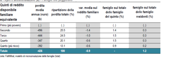 Si stima che siano circa 300mila le famiglie interessate da entrambe le misure che registrano una perdita. Il peggioramento, pari in media a 426 euro, è riconducibile in larga parte alla perdita del diritto al trattamento integrativo dei redditi da lavoro dipendente (c.d. Bonus Irpef).
