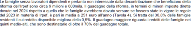 Le famiglie non interessate dalla decontribuzione ma che beneficiano della riforma dell’Irpef sono 9 milioni e 600mila (36,8% delle famiglie residenti). Il guadagno derivante dalla riforma, in termini di minori imposte dirette dovute, è pari in media a 251 euro all’anno e comporta un incremento dello 0,5% del reddito disponibile.