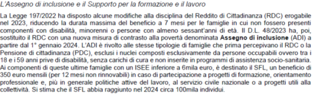 Di queste, sono poco più di 620mila quelle che hanno perso il diritto al beneficio. All’interno di questo gruppo si stima la presenza di 220mila famiglie con componenti non occupabili che perdono il beneficio perché nel decreto istitutivo dell’ADI, a differenza di quanto previsto nel regime RDC, non è presente un innalzamento della soglia di reddito per le famiglie per le famiglie in affitto rispetto a quelle che vivono in casa di proprietà. Tale incremento di soglia è stato in seguito introdotto nella Legge di Bilancio per il 2025.