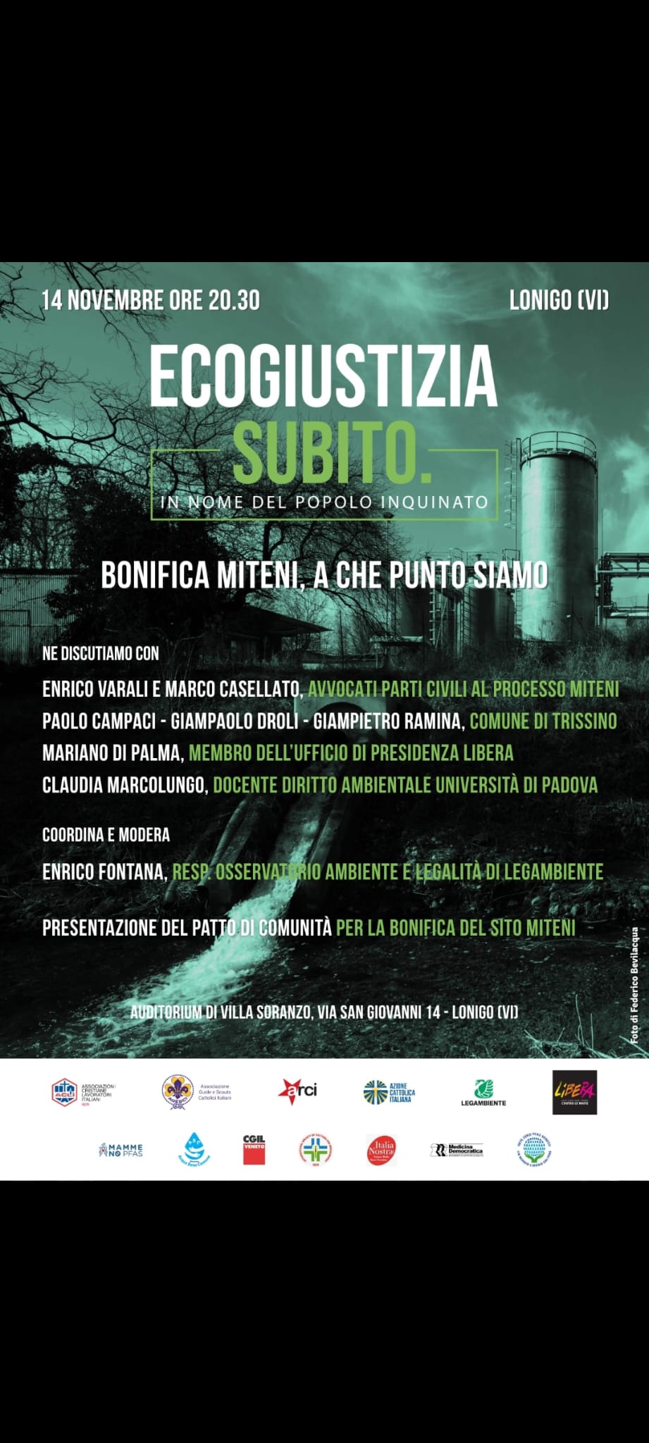 Le associazioni promotrici e aderenti ad Ecogiustizia – ACLI, Azione Cattolica Italia, AGESCI, ARCI, Legambiente, Libera, Mamme No Pfas, Acqua Bene Comune Vicenza, CGIL Veneto, ISDE, Italia Nostra Sezione Medio Basso Vicentino, Medicina Democratica, Rete Zero Pfas Veneto – presenteranno il Patto di Comunità per l’Ecogiustizia nel sito ex-Miteni di Trissino, con l’obiettivo di promuovere una bonifica immediata, trasparente e partecipata dell’area contaminata, a tutela della salute pubblica e dell’ambiente.