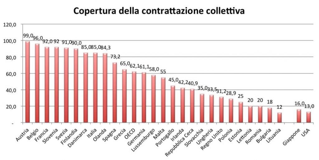 Il contratto nazionale di settore ha subito ovunque un rapido ridimensionamento, laddove quello aziendale è progressivamente divenuto il vero perno di buona parte dei paesi dell’UE. Rispetto al recente passato, hanno cambiato assetto molti i paesi “periferici”, che sono usciti dal novero dei paesi a primato del contratto nazionale, e sono approdati sulle sponde del vasto blocco di paesi europei in cui prevale la contrattazione aziendale. Un sistema contrattuale basato su due livelli, nazionale di settore e aziendale o territoriale, è quello che più duttilmente ed efficacemente si dimostra in grado di coniugare una copertura generalizzata del potere di acquisto e del suo mantenimento, con la possibilità di collegare, nelle aziende più produttive, salari e performance economiche. Il modello italiano ha certamente aderito a questa impostazione, suggellata nel fondamentale protocollo del 23 luglio del 1993. Anche se negli ultimi anni è in corso una retromarcia verso la contrattazione nazionale di categoria, che sarebbe ulteriormente favorita se passasse una soluzione di efficacia generale. Ma il salario minimo legale interromperebbe questo percorso a ritroso. Se il livello dello smic dovesse corrispondere ad una percentuale ragguardevole (il 60%?) del salario medio o mediano (per inciso: i 9 euro lordi previsti nel ddl Catalfo corrisponderebbero all’87% del salario medio nazionale), quali margini economici resterebbero per negoziare i le tabelle salariali dei ccnl?