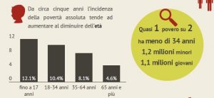 “Il fatto che la povertà tende ad aumentare al diminuire dell’età testimonia che sono soprattutto i minori ed i giovani i nuovi poveri, le categorie più svantaggiate. Oggi quasi un povero su due è un giovane in Italia. Ed ancor più significativo è il fatto che l’istruzione continua ad essere tra i fattori che più influiscono, oggi più di ieri, sulla condizione di povertà: chi è meno scolarizzato è oggi tagliato fuori non solo dal mercato dal lavoro ma anche da ogni attività di inclusione sociale.  La povertà educativa è uno dei principali problemi del nostro paese, un fenomeno come sottolinea anche la Caritas principalmente ereditario, che riguarda in gran parte famiglie colpite dalla tradizionale povertà socio-economica, soprattutto nel Mezzogiorno”.
