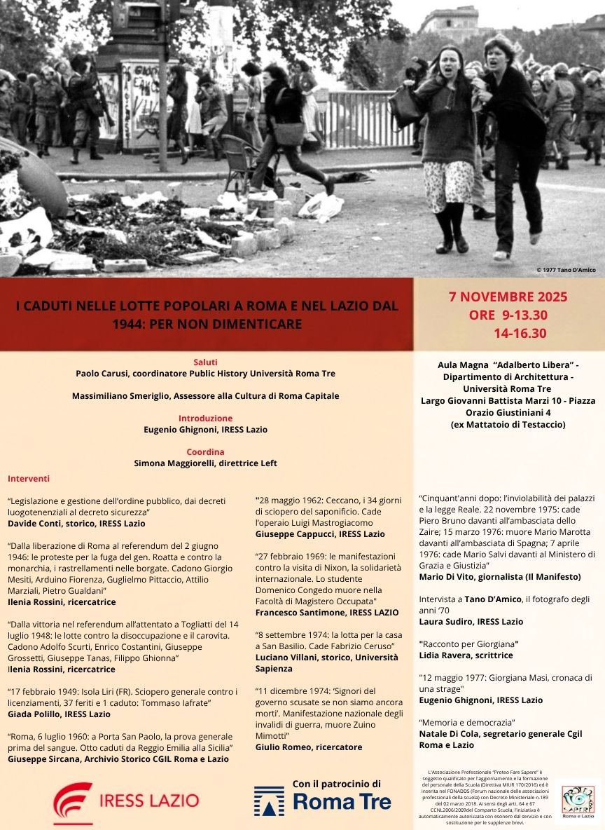 Si terrà venerdì 7 novembre 2025 il convegno ‘I caduti nelle lotte popolari a Roma e nel Lazio dal 1944: per non dimenticare’, promosso dall’Istituto di Ricerche Economiche e Sociali del Lazio (Iress Lazio) in collaborazione e con il patrocinio dell’Università Roma Tre e in collaborazione con l’Associazione Proteo Fare Sapere Lazio. L’iniziativa si svolgerà presso l’Aula Magna ‘Adalberto Libera” del Dipartimento di Architettura (ex Mattatoio di Testaccio).