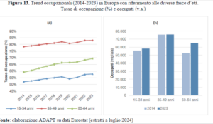 Un’analisi dettagliata dei trend occupazionali per classi d’età rivela come i cambiamenti demografici in atto stiano influenzando il mercato del lavoro. Se si osserva l’andamento dell’indice di occupazione (2014–2023) rispettivamente in Europa e in Italia per le diverse fasce d’età si può facilmente intuire come il tasso di occupazione riferito ad entrambi i territori sia aumentato per tutte le classi d’età. In Europa, tra il 2014 e il 2023, l’indice è cresciuto di 5,7 p.p. per la fascia 15-34 anni (dal 52,1% al 57,8%), di 4,7 p.p. per la classe 34-49 anni (dal 78,3% all’83%) e di 10,3 p.p. per quella 50-64 anni (dal 59,2% al 69,4%). In Italia, l’aumento è stato del 6 %. per la classe 15-34 anni (dal 39% al 45%), 5,2% per quella 35-49 anni (dal 71,1% al 76,3%) e del 9,2 %. per la fascia 50-64 (dal 54,1% al 63,4. L’incremento più significativo, sia nel caso dell’Europa che nel caso dell’Italia, si è avuto per la classe d’età più avanzata (50-64 anni). Questo fenomeno evidenzia un progressivo invecchiamento del mercato del lavoro, riflesso diretto dell’invecchiamento generale della popolazione, e segnala una trasformazione strutturale nella composizione demografica della forza lavoro.