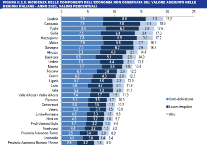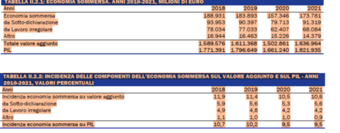 Sulla base dei Conti nazionali pubblicati a marzo del 2024, il valore aggiunto generato dal sommerso economico si attestava, nel 2021, a 173,8 miliardi di euro, segnando una crescita del 10,5% rispetto all’anno precedente (quanto era  pari a 157,3 miliardi). Le componenti più rilevanti dell’economia sommersa sono quelle legate alla correzione della sotto-dichiarazione del valore aggiunto e all’impiego di lavoro irregolare. Nel 2021 esse determinavano, rispettivamente, il 52,5% e il 39,2% del valore aggiunto complessivo generato dall’economia sommersa, di cui è bene notare i 68 miliardi prodotti dal lavoro irregolare (4,2% del PIL).