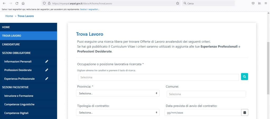 Il sistema MyAnpal suggerisce di inserire curriculum e varie altre informazioni sulla propria storia lavorativa, in modo da facilitare il restringimento della ricerca. Non inserisco nulla. Per adesso non mi interessa restringere il campo, anzi voglio allargarlo il più possibile, per vedere quali e quanti lavori mi offre il mercato in Italia o una Regione e poi scegliere. In fondo, uso la stessa logica di quando si cerca casa: si consulta un sito che fornisce all’utente tutti i possibili risultati della città, e successivamente si aggiungono vari parametri per restringere il campo di ricerca, come il costo massimo della casa, la metratura, il quartiere, il piano e così via.