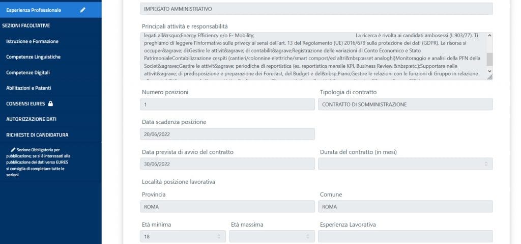 Riprovo lo stesso lavoro a Milano, la seconda più popolosa d’Italia e uno dei motori produttivi del Paese: 8 risultati, di cui 6 sono fotocopiati, quindi 3 effettivi. Un contratto di somministrazione (tra l’altro la stessa azienda di Roma), due a tempo determinato. Apro i dettagli. Va in crash il sito. Riaggiorno. Ad offrire il lavoro è Openjobmetis S.P.A., un’agenzia per il lavoro privata, accreditata da Anpal (l’Albo delle agenzie e dei soggetti accreditati da Anpal è consultabile se prima si accede a MyAnpal). Il campo della durata del contratto è in bianco, così come altre voci.