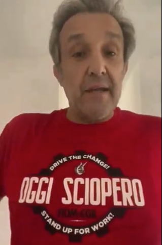 Prima dei contenuti salta all’occhio la t-shirt targata Fiom-Cgil indossata da Insinna: rosso evocativo, un ingranaggio nero e lo slogan che grida: “Drive the change! Stand up for work! Oggi sciopero”. La voce dei ventimila che hanno sfidato la pioggia di quella giornata di mobilitazione. “Questa maglietta me l’hanno regalata le lavoratrici e i lavoratori, è preziosissima e ve la volevo far vedere”, dice il conduttore rivolgendosi ai suoi follower raccontando delle “tante storie” ascoltate quella mattina, ma anche dei sorrisi e delle foto scattate con chi l’ha riconosciuto tra la folla di Piazza del Popolo: “Momenti anche di speranza e fiducia”, nonostante sia “tutto difficilissimo”.