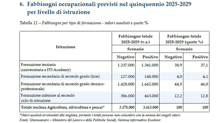 Secondo il Report le imprese italiane e la Pubblica Amministrazione, nei prossimi cinque anni (2025–2029), esprimeranno un fabbisogno occupazionale molto orientato verso profili con istruzione tecnica e terziaria.