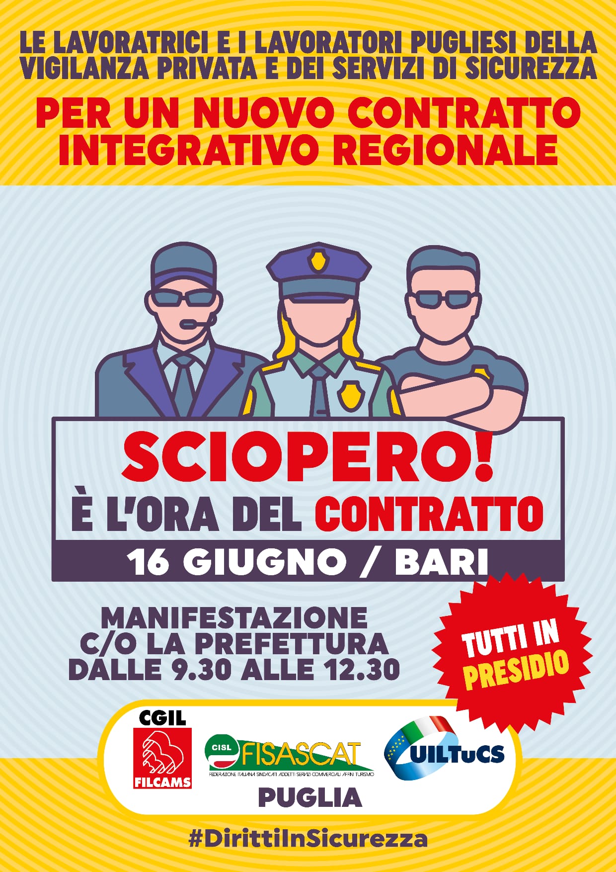 Lunedì 16 giugno l’intero comparto della vigilanza armata e dei servizi di sicurezza in Puglia incrocia le braccia per lo sciopero regionale indetto da Filcams-Cgil, Fisascat-Cisl e Uiltucs-Uil a sostegno della richiesta di un contratto integrativo regionale di settore. Inoltre, dal 10 al 25 giugno è in atto anche il blocco delle prestazioni di lavoro straordinario.